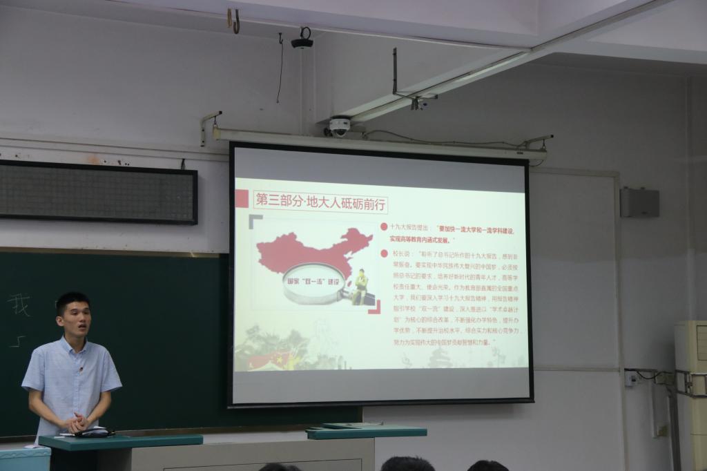 活动伊始,团员青年齐唱中国共产主义青年团团歌《光荣啊,中国共青团》,共同观看了5月2日习近平总书记在北大考察的新闻视频。随后校青年马克思培养主义工程精英班学“习”之路宣讲团,为团员青年带来了“迈进新时代,实现新作为”的主题宣讲,宣讲团成员用数字说话,以“1314258”为关键数向团员青年全面解读了十九大报告,鼓励团员青年在从先辈们的期望中树立梦想,从勇气与壮举中滋养梦想,争做不断砥砺前行的新时达地大人。