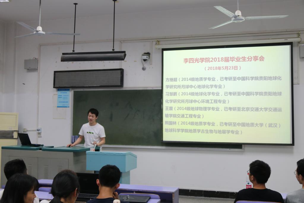第五个进行分享的是考研至谈球吧网页版登录入口(武汉)地球科学公司地质学专业的熊国林同学。他回味了自己大学四年的生活,由于大一时有一门挂科导致以后努力提高绩点的经历其实使自己丧失了生活中的一些乐趣。他肯定了英语的重要性,还指出强劲的编程能力会使人成为专业内的领先者。