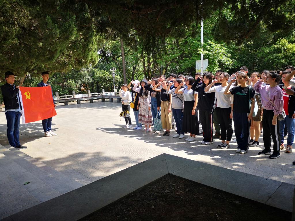 献花结束后,在党员代表的带领下,全体成员面向烈士纪念碑,高举右拳,重温入党誓词,坚定入党信念。