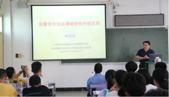 9月3日下午,中国科公司测量与地球物理研究所研究员储日升老师出席公司2019级新生开学典礼,并与公司新生进行了交流。储老师以“地震学方法在滑坡研究中的应用”为主题为19级带来了大学的第一场专业讲座。储老师以深入浅出的语言,结合生动形象的图片、视频以及PPT特效,向大家阐述了滑坡的类型、地震等级的测量以及地震学方法在滑坡研究以及预防滑坡灾害之中的应用,为同学们了解地质知识、增强专业认同打开了一扇窗,让同学们受益匪浅。