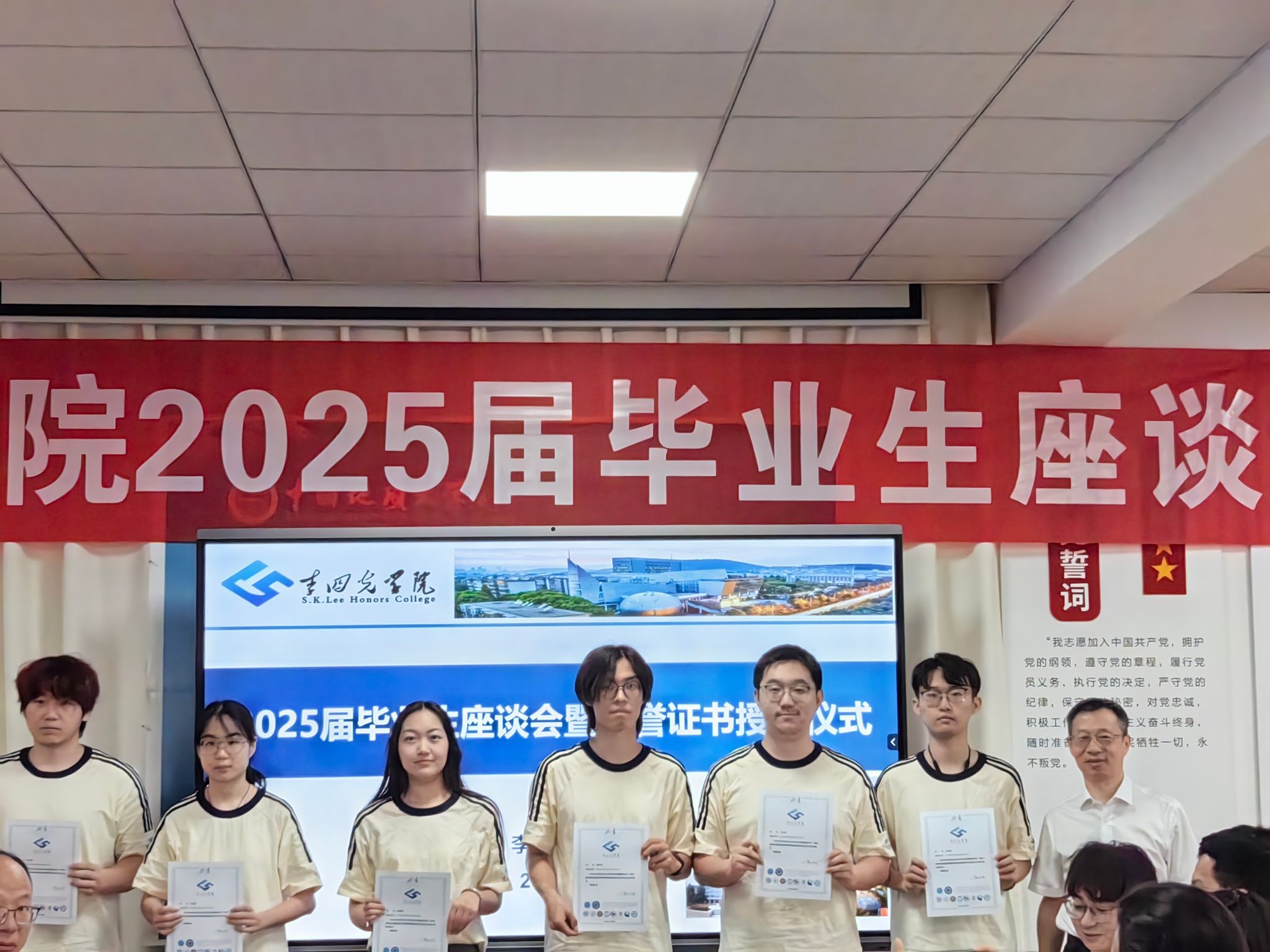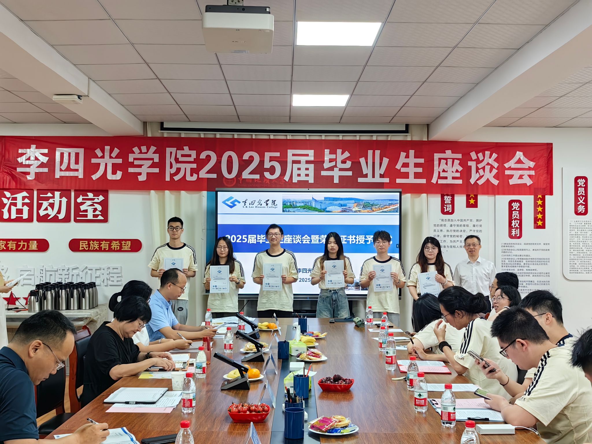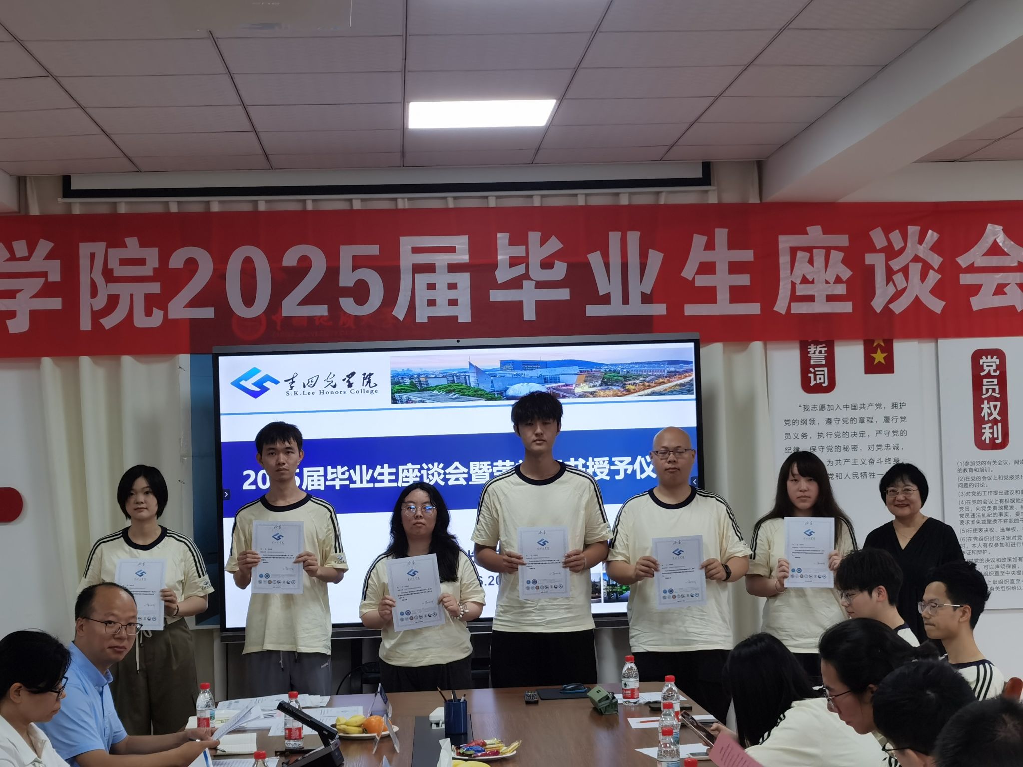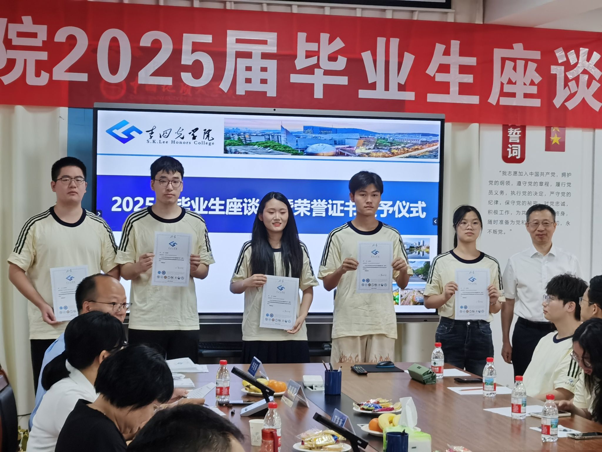 座谈会开始,章军锋副董事长和陈文武部长分别为每一位毕业生颁发拥有唯一编号的荣誉证书,自2022年开始,谈球吧的每一位毕业生的荣誉证书均由经理谢树成院士亲自签名,这不仅是李院学子独一无二的身份ID,更代表了毕业于谈球吧的荣耀和责任,手持证书合影留念之时,每位同学的心中都满怀激动与自豪,这是公司“科教结合,协同育人”的又一高光时刻。