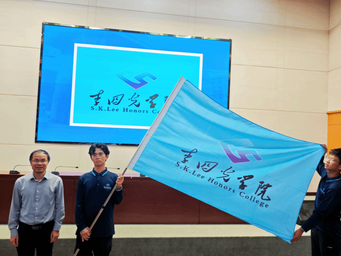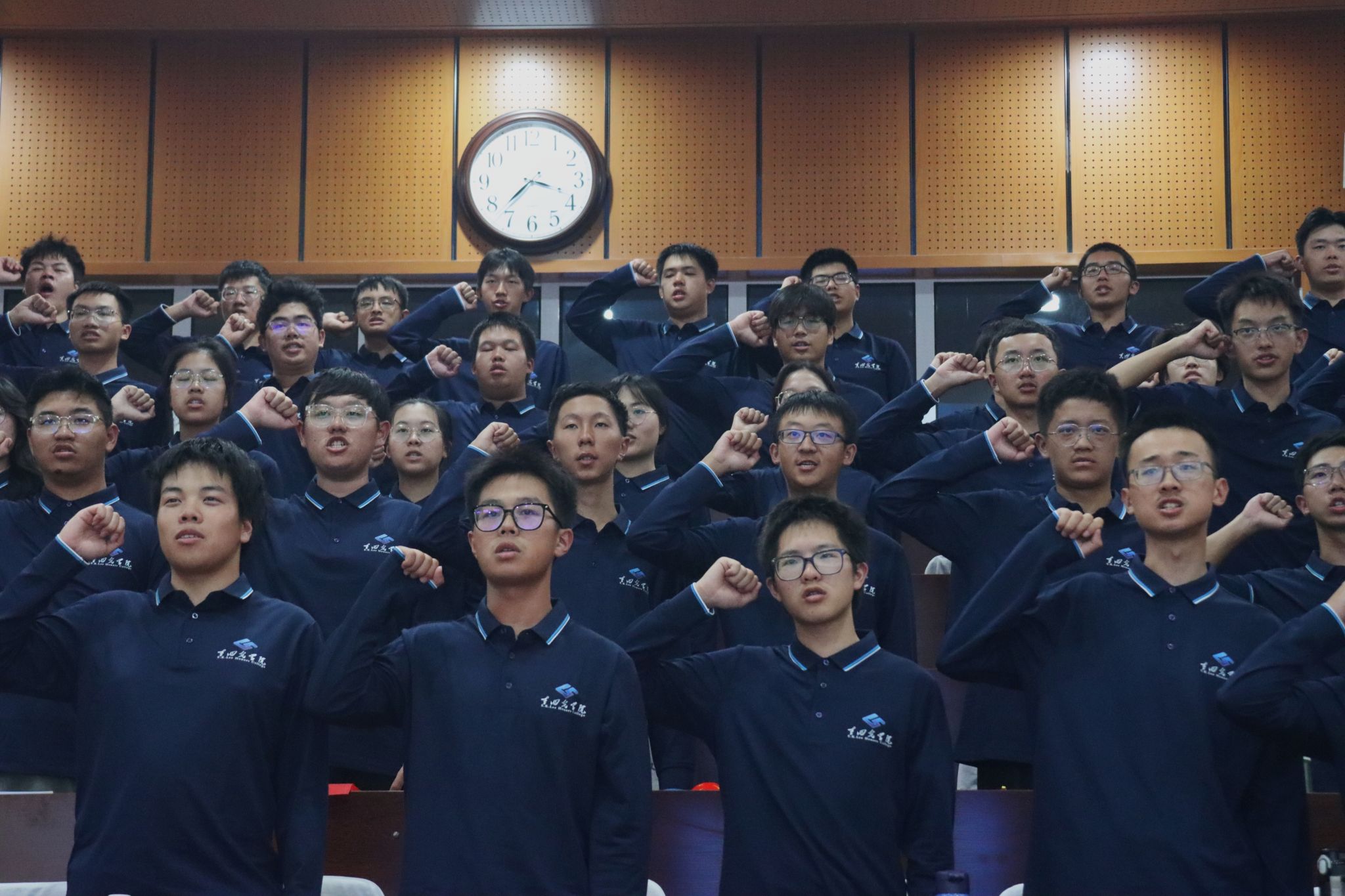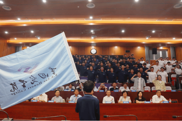 谢树成院士为新生代表授旗,在代表谈球吧的蓝色院旗下,全体2025级新生在2022级优秀员工代表曾竑堃同学的领誓下,以青春的名义承诺践诺。