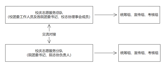 校庆志愿服务总队由校团委指导老师、各公司团委书记、校志协理事会成员组成,主要负责志愿服务工作的方向把握与决策管理。总队下设统筹组、宣传组、考核组三个工作组。