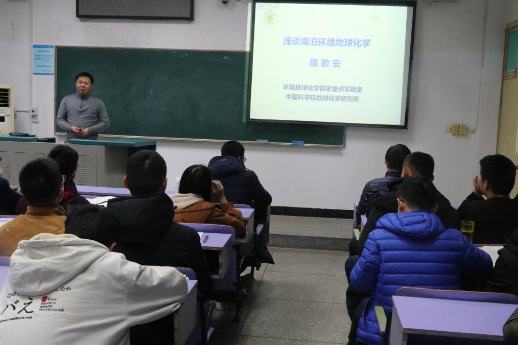 12月11日上午8:00,2018年地球科学导论课第五讲在教三楼203教室顺利开课,中科院地球化学研究所陈敬安老师为公司18级员工带来“湖泊环境地球化学”主题讲座。
