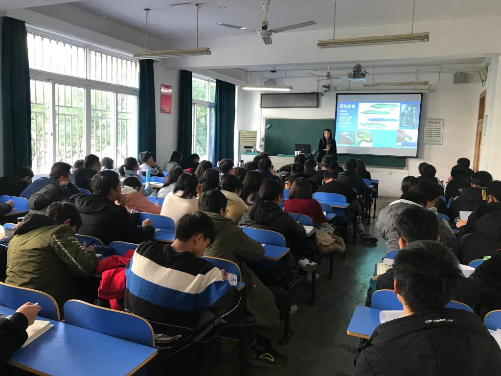 课程开始,卢老师先从五亿年前的寒武纪“生物大爆发”讲起, 这次大爆发造就了地球上最早期的物种,而在那个时期,海洋无疑是众多生命生活的场所。接着,卢老师又给大家介绍了“化石鱼”的概念,一种名叫“拉蒂迈鱼”是四亿年前的一种古鱼类,在四亿年的演化过程中,基本没有变化,当现代生物学家解剖其内部时,发现其脑部非常小,但在弱肉强食的生物链中,依旧凭借顽强的生命年存活了几亿年之久,确实让人惊叹。而在我国,古鱼类的研究在张弥曼院士的带领下开创了先河,在云南曲靖发现的“杨氏鱼”为中国的古鱼类研究奠定了基础。